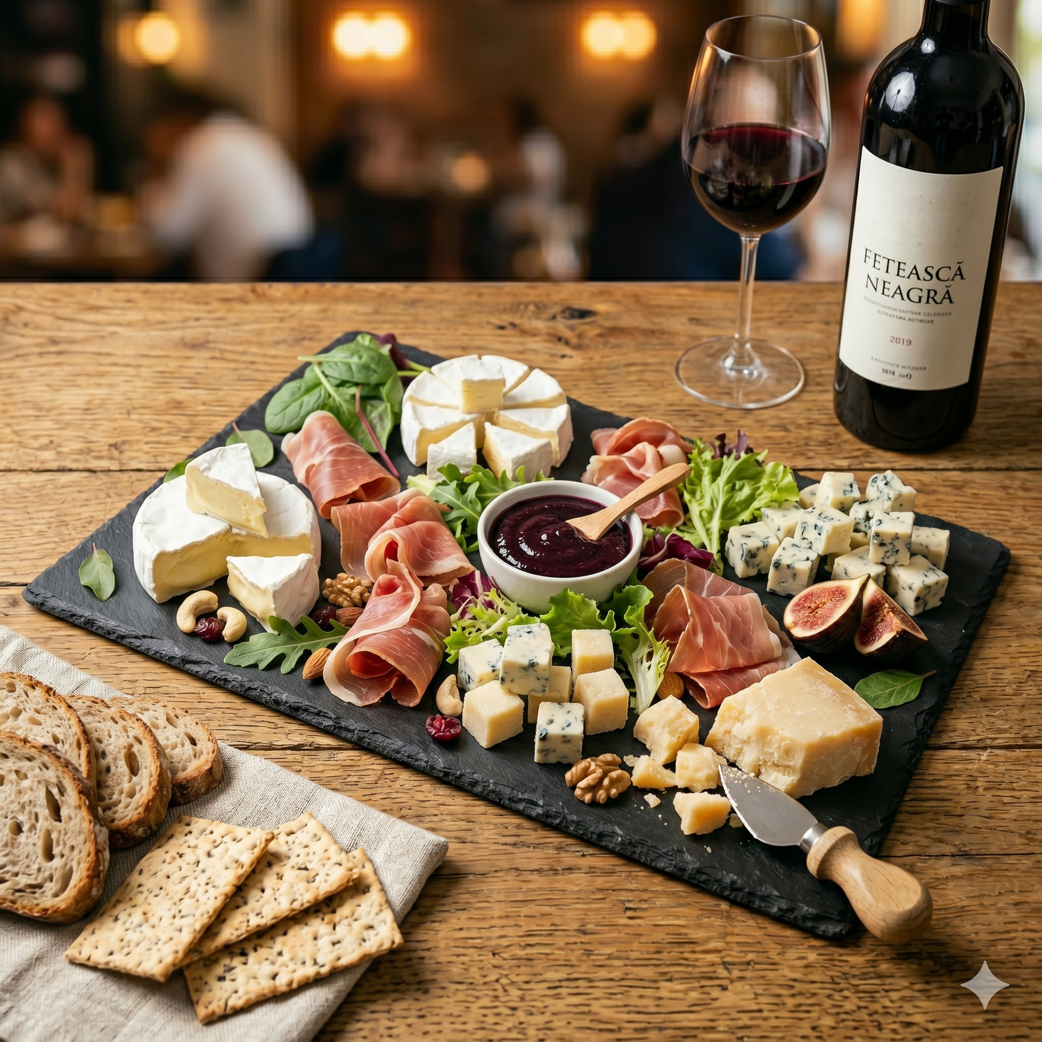 O selecție nobilă pentru împărțit: brânză cu mucegai, Brie cremos, Camembert și Parmezan, acompaniate de prosciutto crudo, dulceață de fructe de pădure și nuci.