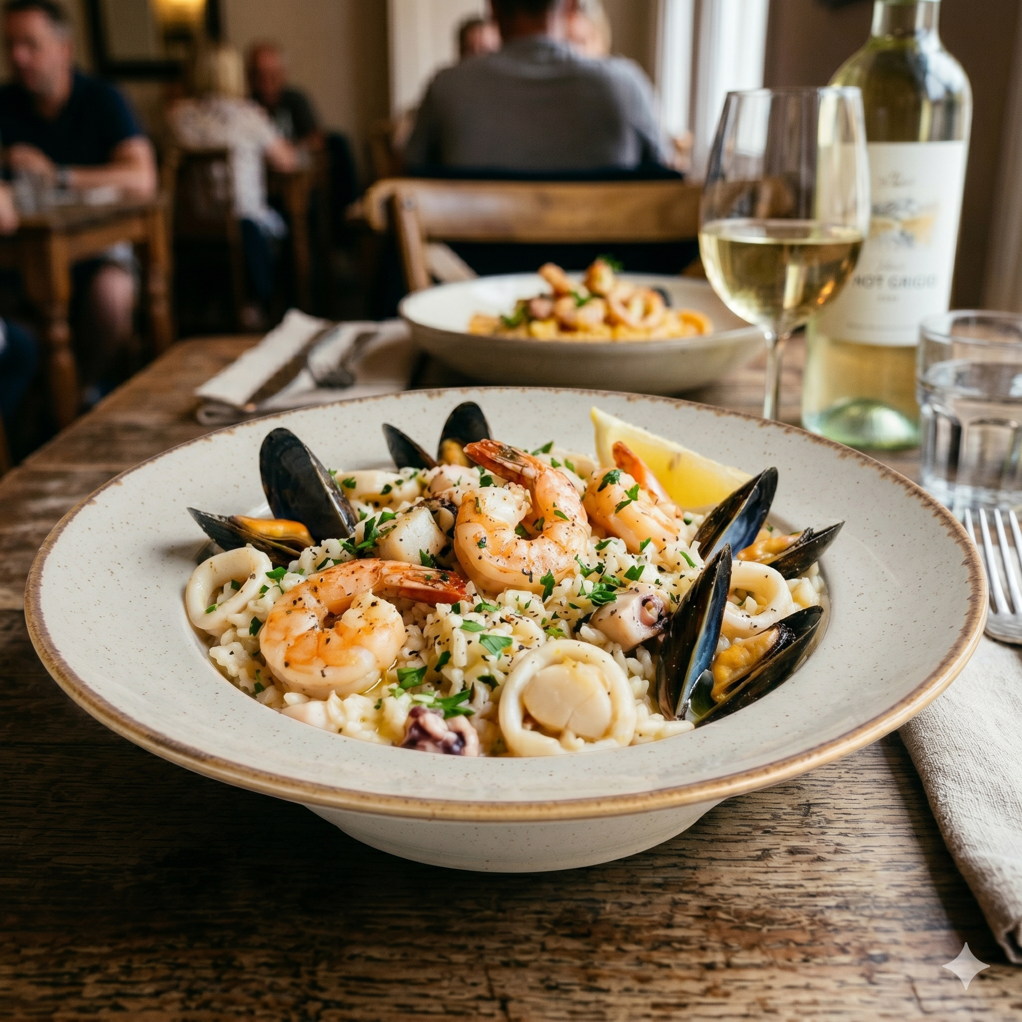 Orez cremos gătit lent, cu ingrediente de calitate. Conține: Orez, mix fructe de mare, creveti, midii.