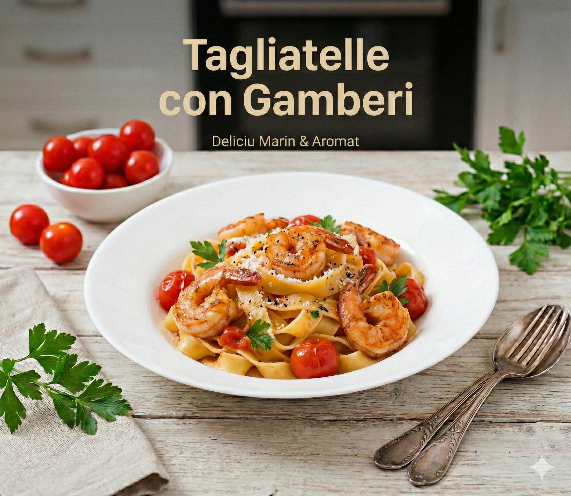 Paste late servite cu creveți suculenți, dovlecel proaspăt și roșii cherry, într-un sos fin de vin alb și unt.